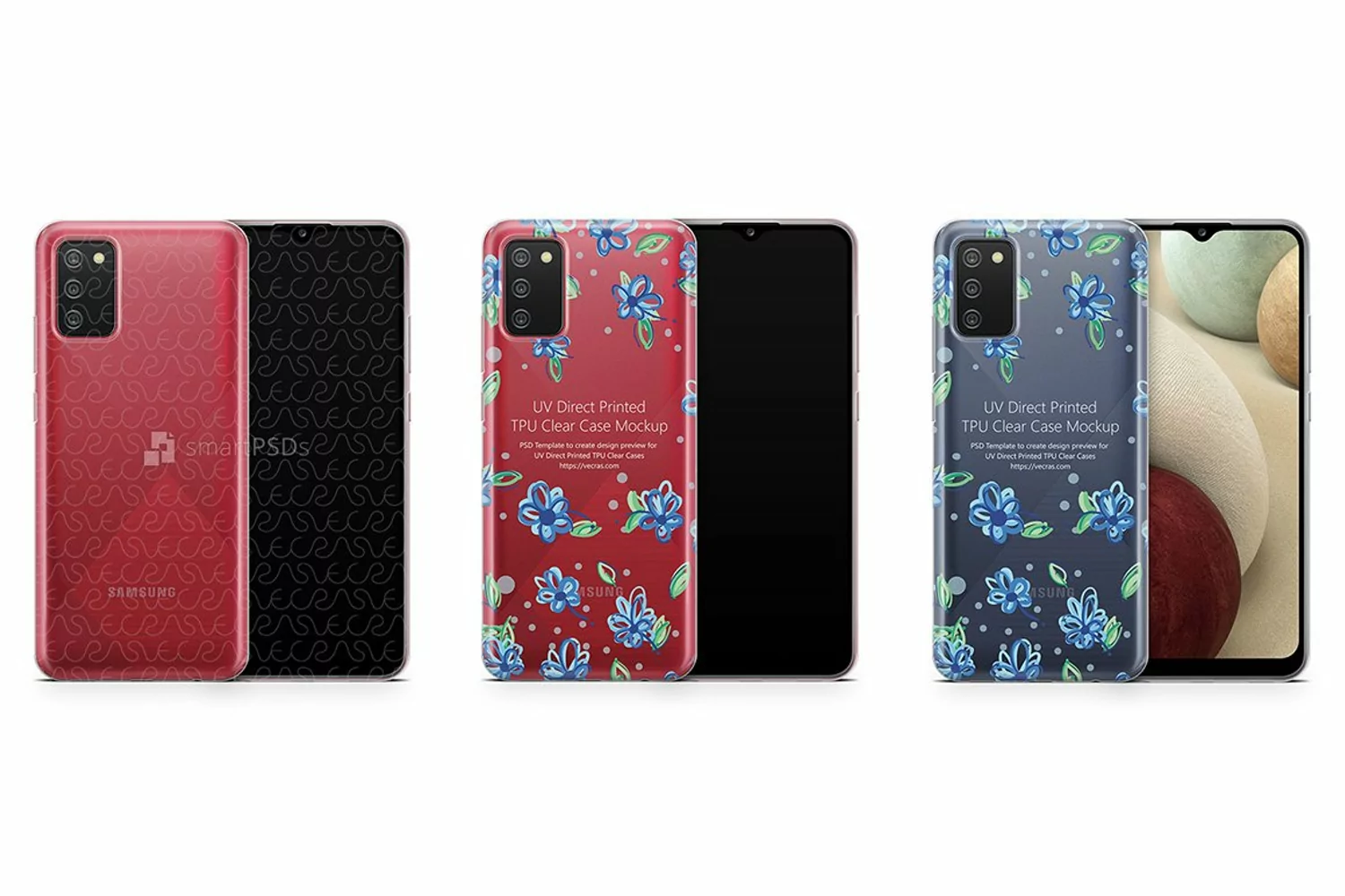 Easy to use, fully editable Galaxy A02s (2020) Smart PSD mockup file for making TPU Soft Case design preview, suitable for UV direct print.