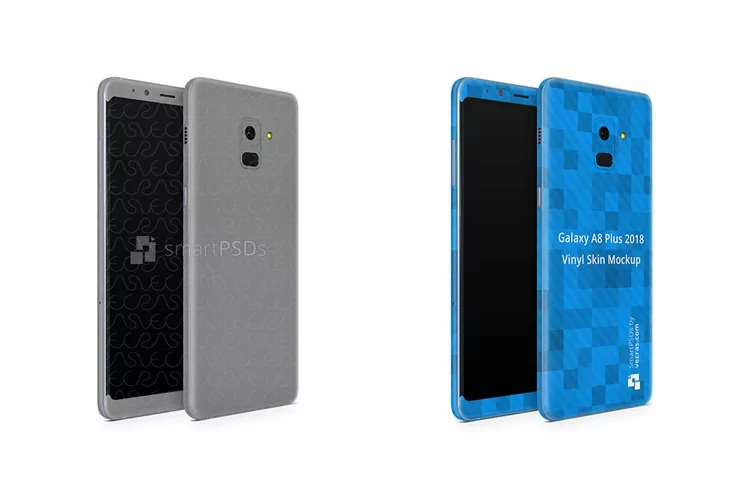 Smart PSD mockup to make skin/decal design preview image for Samsung Galaxy A8 Plus phone vinyl sticker. 3 variations added;