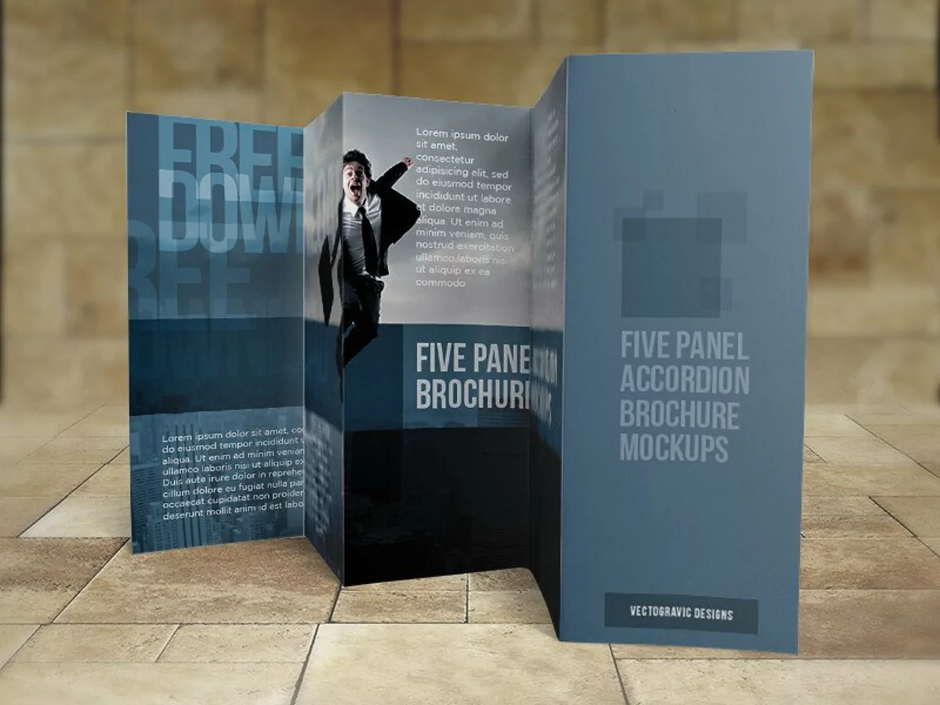 Another five-panel accordion brochure mockups in 8.5"x14", This package consists of 9 PSD files with different angles and perspectives, give you more choices on how to showcase your designs, so easy to edit and has a high-resolution pixel.