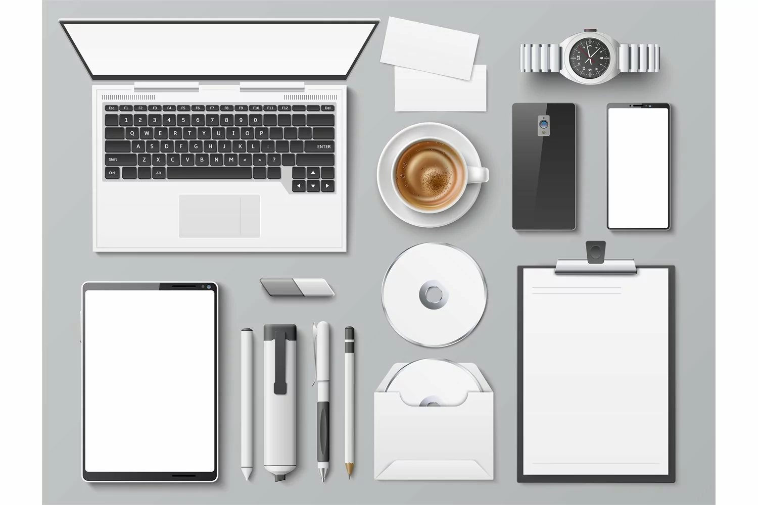 Realistic desktop top view. Office workplace with different supplies. Digital device. Stationery or paper tablet. Coffee cup. Visit cards. Computer disk. Vector set of blank business identity mockup