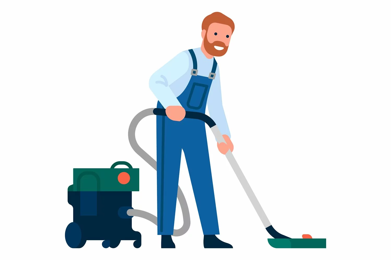 Man working with professional vacuum cleaner. Janitor cleaning floor isolated on white background