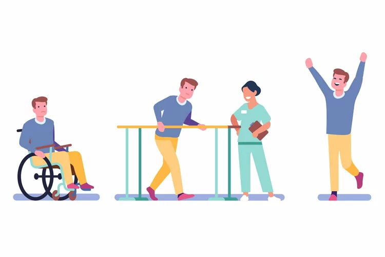 Young man stands up from his wheelchair as result of rehabilitation. Medical treatment process. Doctor helps disabled guy to walk. Physiotherapy progress. Health recovery. Clinic rehab. Vector concept