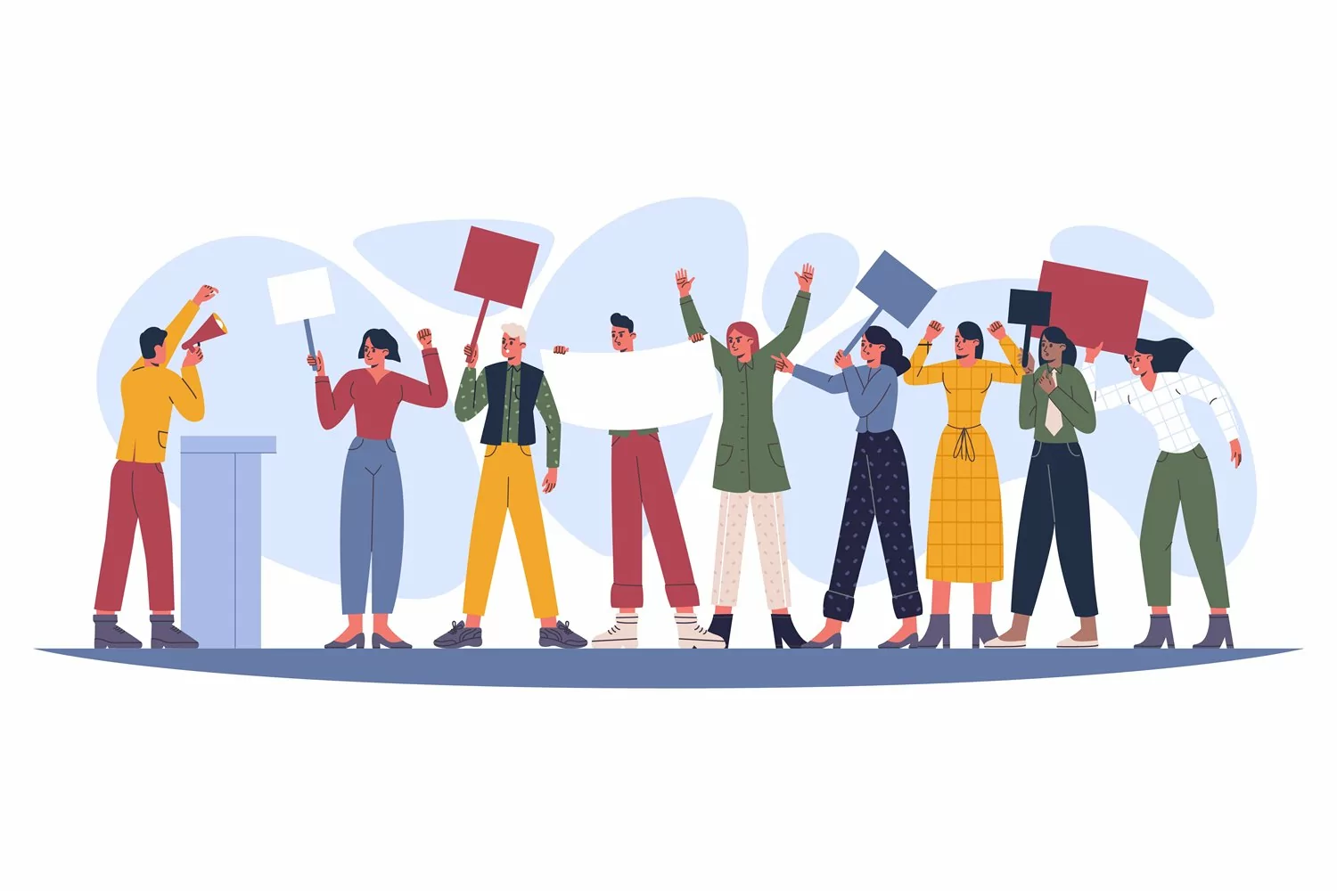 Agitator at rally. Man with megaphone speaks to public. Loud appeals at tribune. Slogans or announcements. Cartoon people with posters at demonstration. People crowd. Activists protest. Vector concept