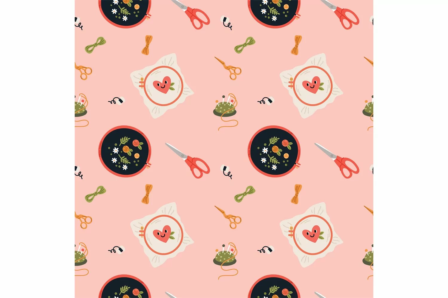 Cartoon embroidery in round hoop seamless pattern. Handmade crafts. Creative hobby. Thread stitches. Scissors or needles. Sewing tools. Needlework artisan. Repeated print. Garish vector background