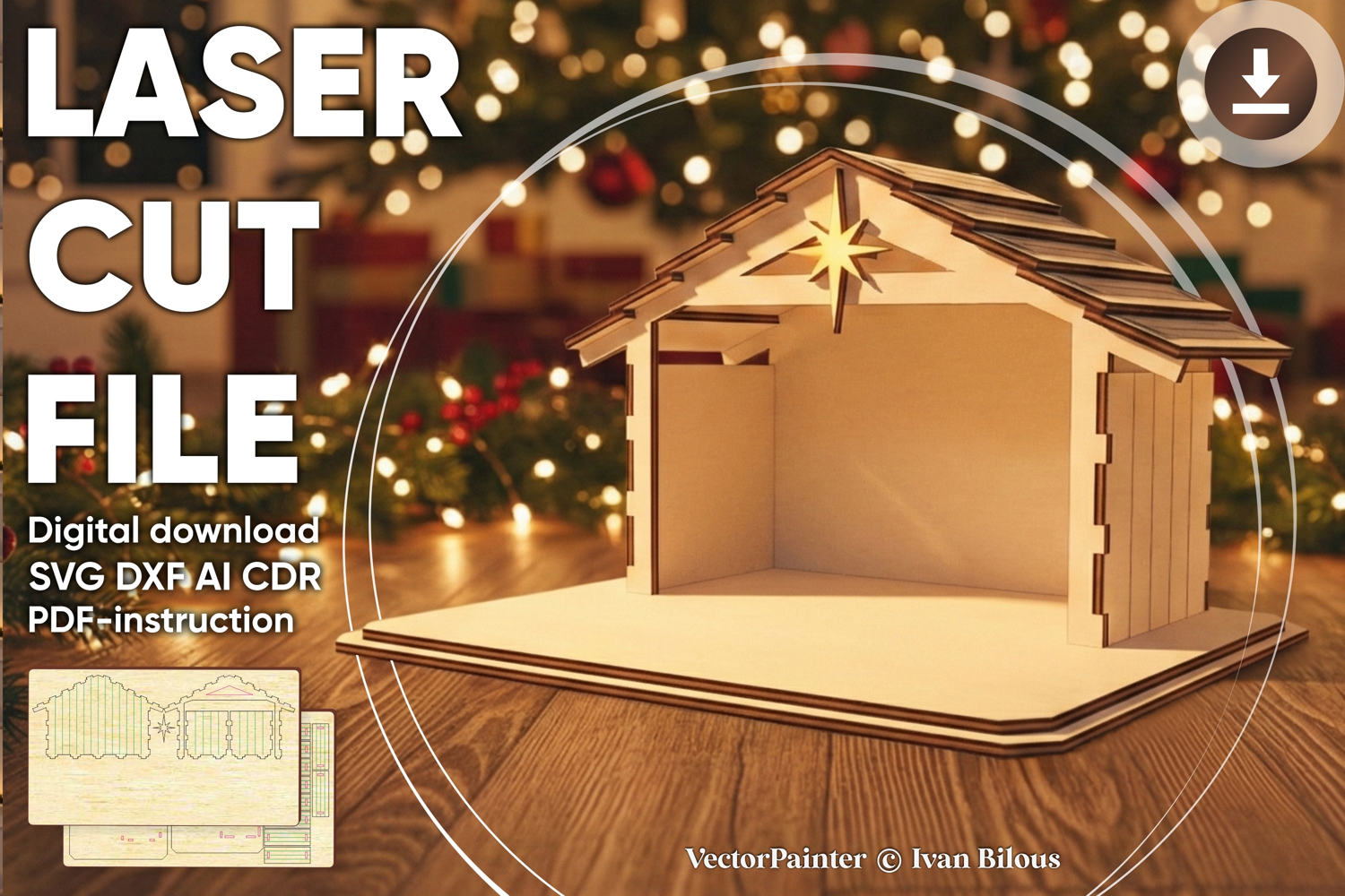 Laser cut design "Nativity barn #2". Vector plan for CNC.