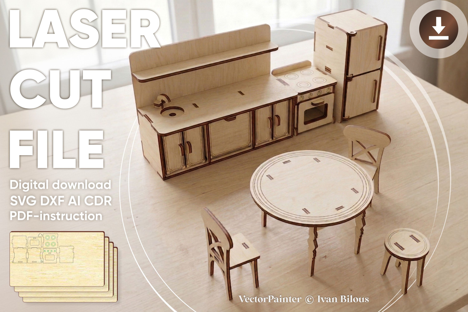 the CDR, DXF, AI and SVG file for laser cutting and PDF-assembly instruction