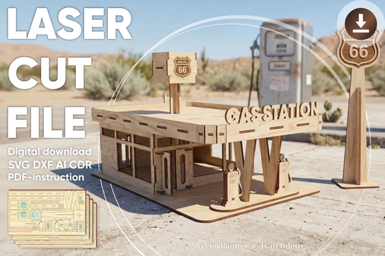 Laser cut design "Retro gas station". Vector plan for CNC.