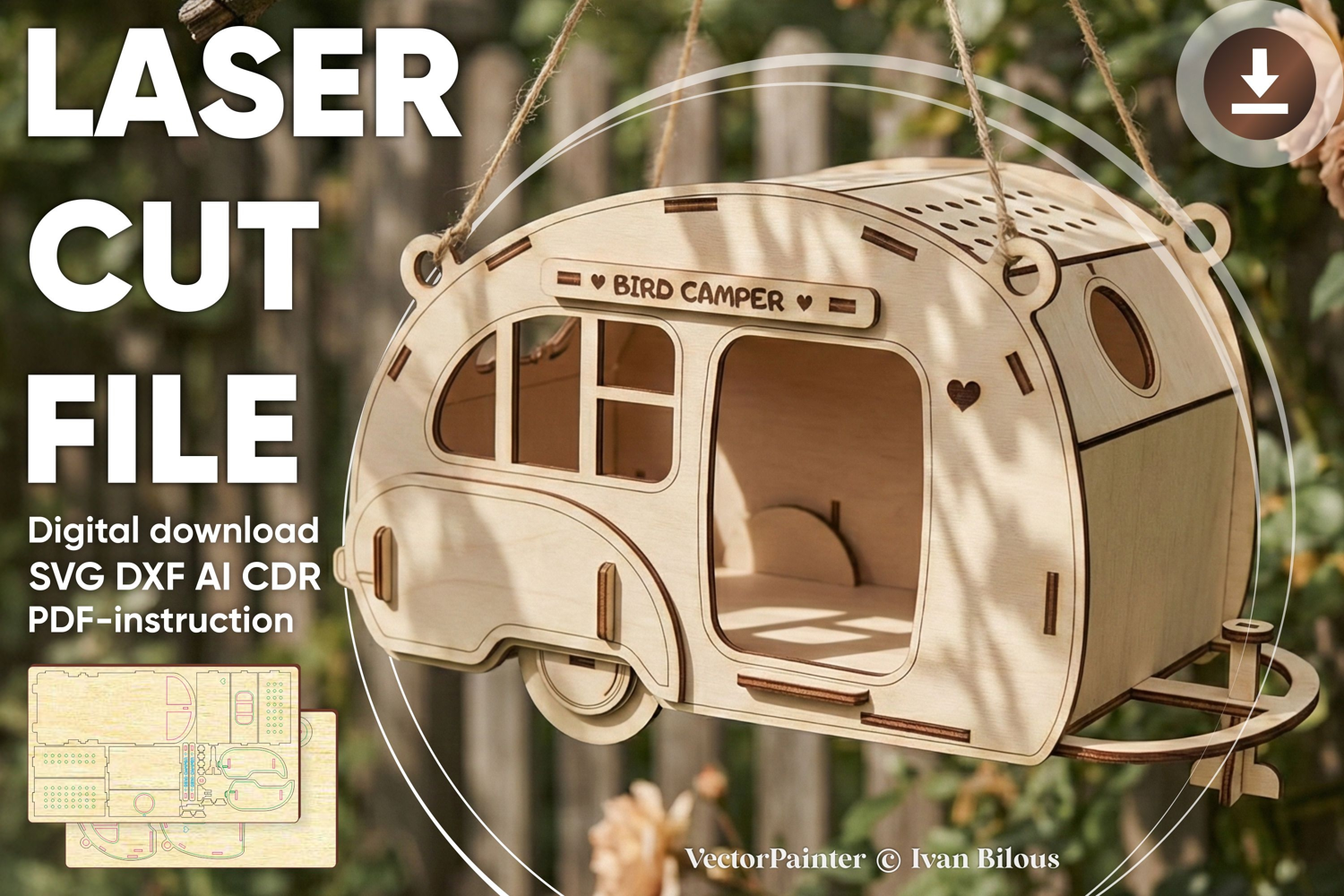 Laser cut design "Camper Birdhouse". Vector plan for CNC.