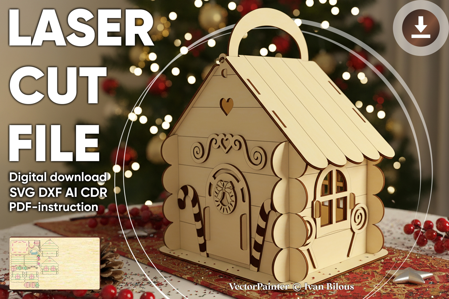 Laser cut design "Gingerbread House Box for sweets". Vector plan for laser cutting machine