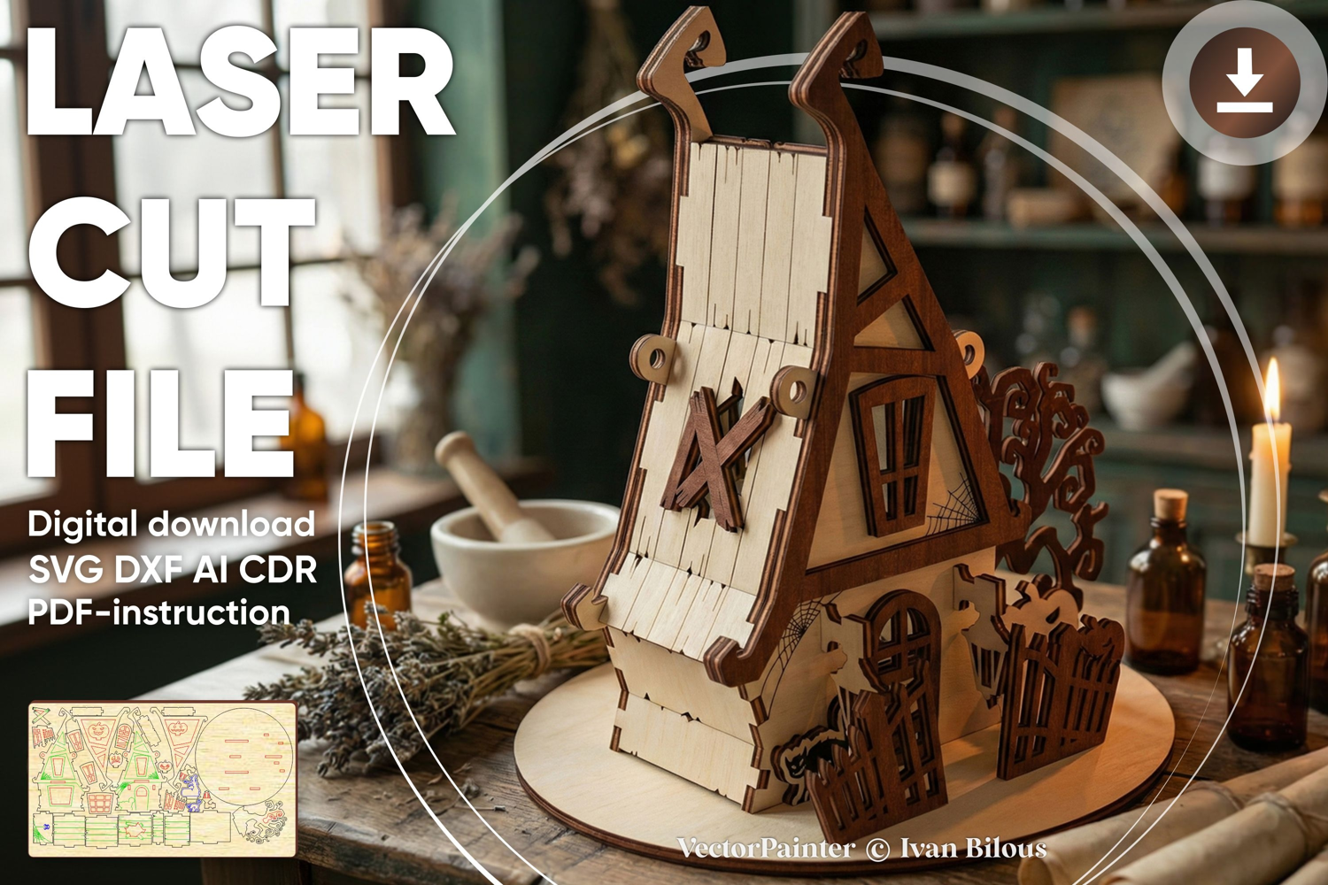 🎨 Laser cut design "The Witch's house" - Halloween miniature of house 🎨