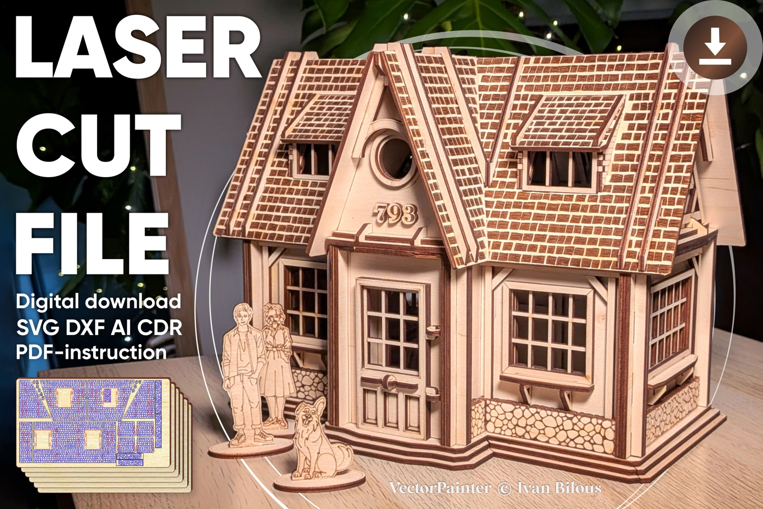 Laser cut file for a detailed dollhouse project, this Country House design captures the warmth and charm of rustic living in miniature form. Featuring an accessible first floor and a removable roof, it allows easy access for arranging furniture, decorations, or figurines.
