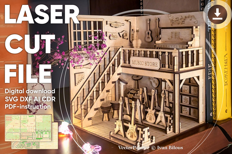 This laser cut design was born from my love of old music shops, the kind filled with wooden instruments, soft light, and quiet inspiration. I wanted to capture that feeling in a tiny world you can build yourself, turning it into a file you can bring to life on your own shelf.