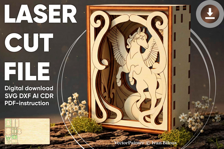 Laser Cut decorative box that brings a Pegasus fantasy scene to life — a magical design where elegance, myth, and craftsmanship meet in a detailed SVG digital file for laser cutting.