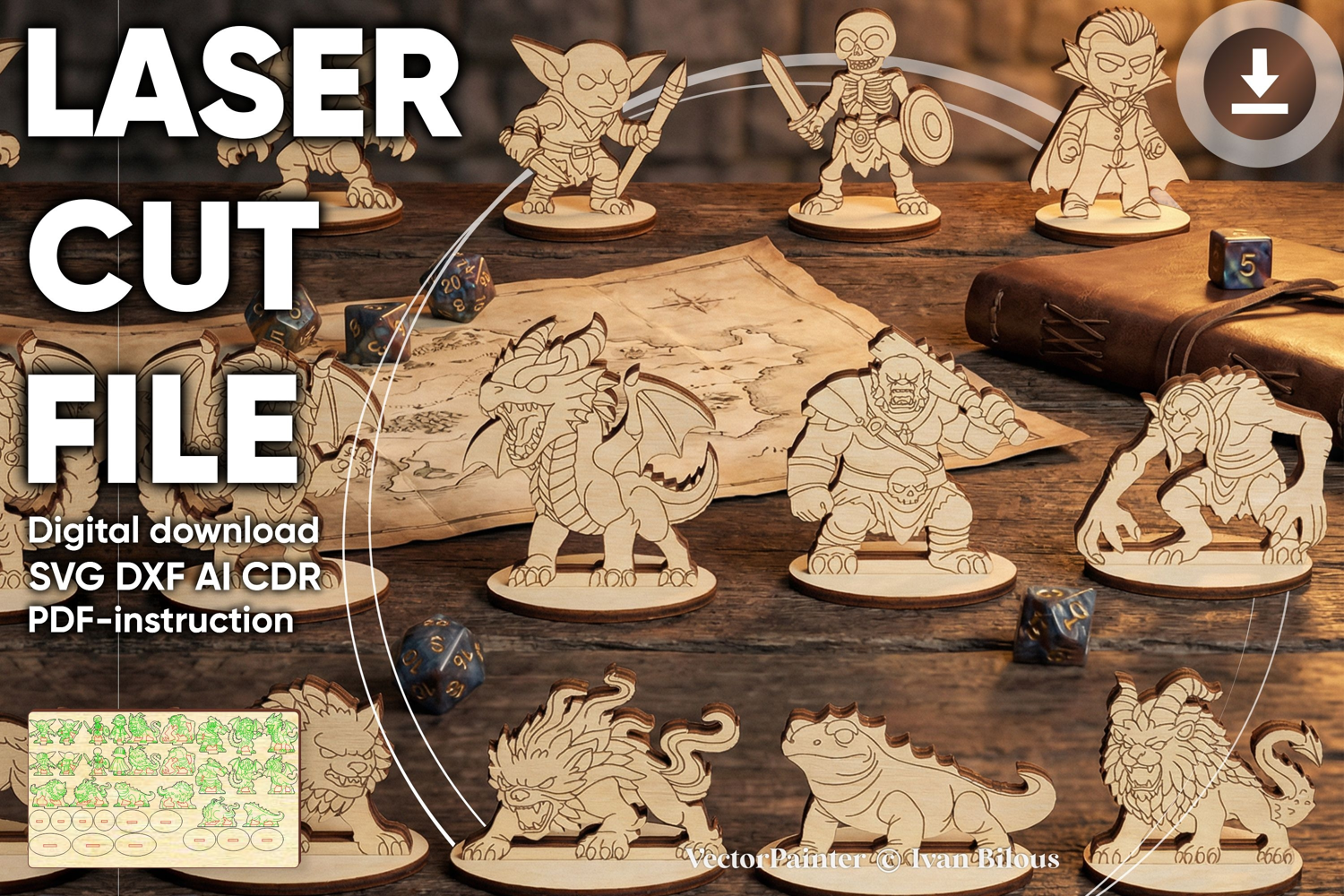 Digital laser cut file set featuring fantasy RPG tabletop monsters designed for board games and role-playing campaigns. This CNC-ready SVG template allows you to create wooden monster miniatures compatible with tabletop battle maps and gaming terrain setups.