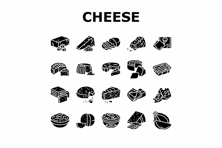 cheese food slice piece dairy icons set vector. cheddar milk, swiss product, parmesan gourmet, snack breakfast, tasty fresh yellow cheese food slice piece dairy glyph pictogram Illustrations. Formats: JPG, EPS