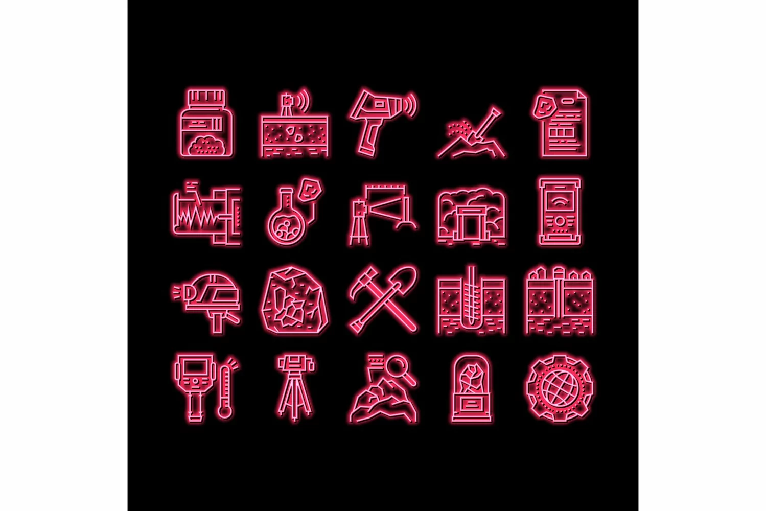 Geology Researching neon light sign vector. Gyro Theodolite And And Laser Level, Field Controller And Thermal Imager Geology Equipment Illustrations. Formats: JPG, EPS