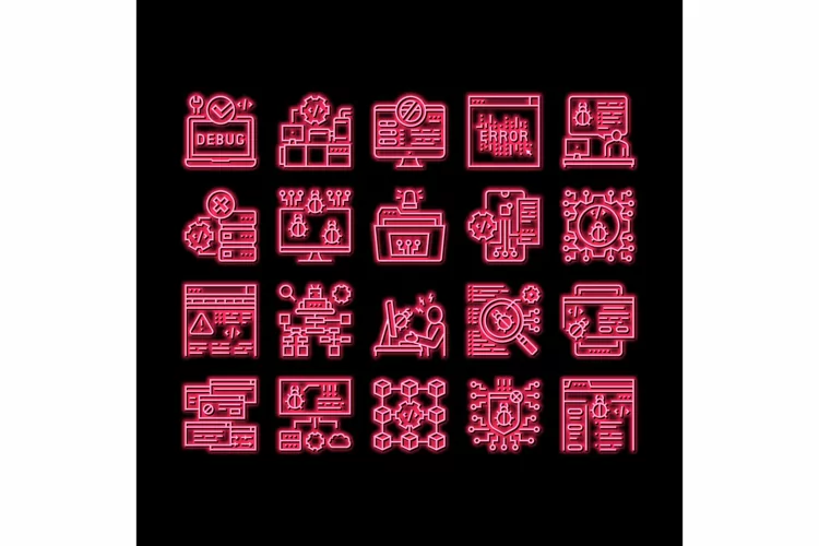Debug Research And Fix neon light sign vector. Debugging Servers And Data Store, Development And Testing Application On Debug Illustrations. Formats: JPG, EPS