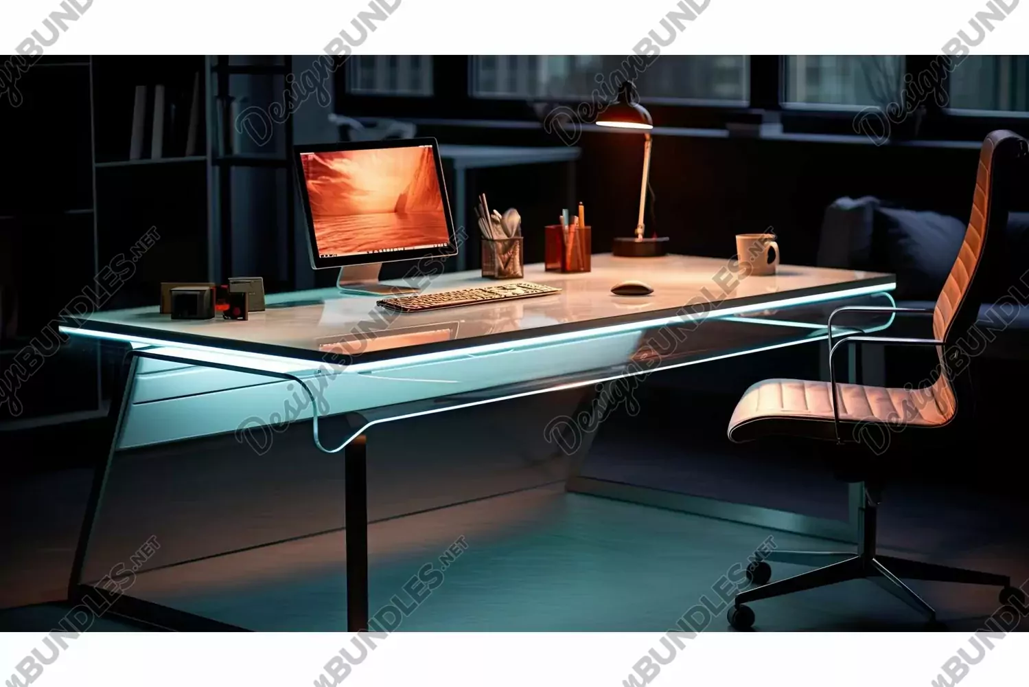 modern light desk illustration sleek glass, metal strip, ambient glow modern light desk