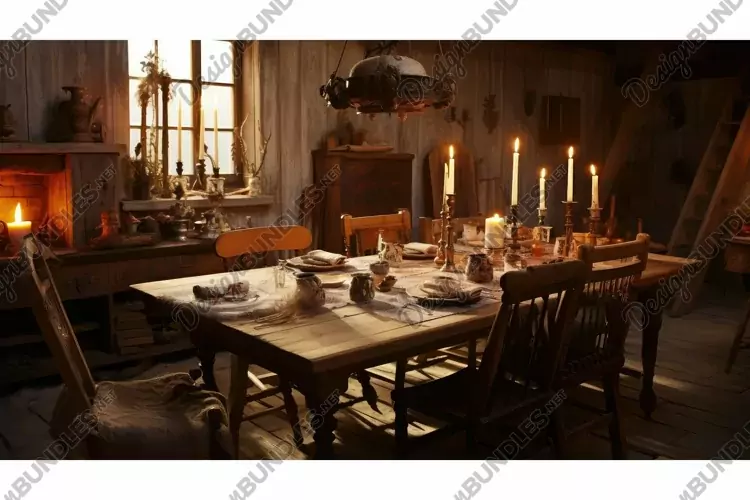 cozy table interior room illustration elegant chic, contemporary vintage, rustic industrial cozy table interior room