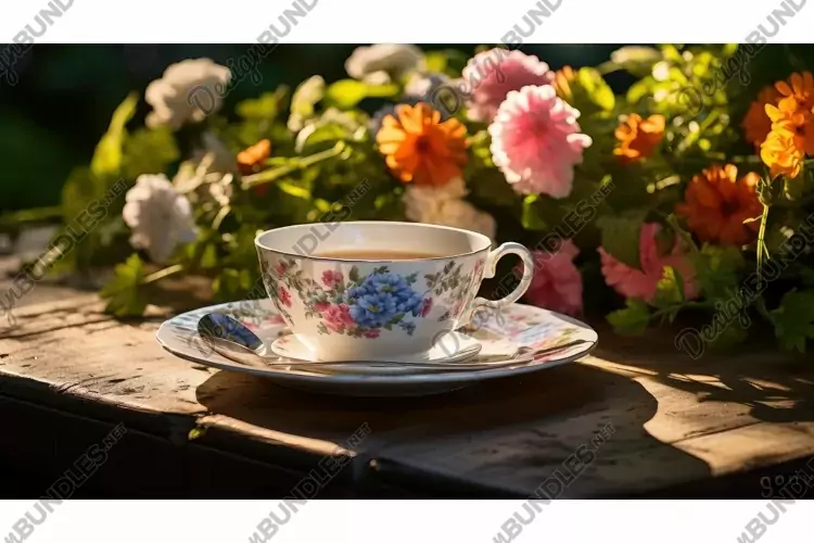 Illustration Flowers Garden Tea Grey Bench Contrast Cup Porcelain Earl