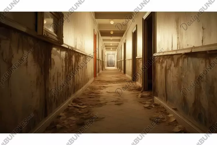 vintage blurred hallway interior illustration corridor wallpaper, carpet soft, details evoking vintage blurred hallway interior
