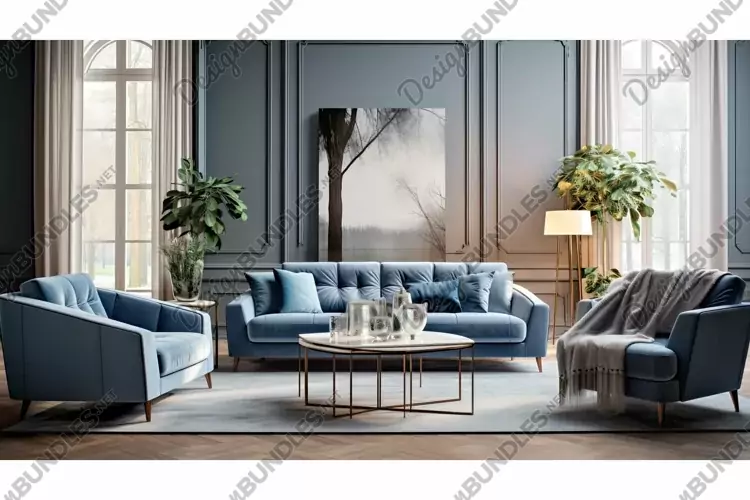 Modern Illustration Blue Furniture Gray Sophisticated Living Atmosphere Room Calming