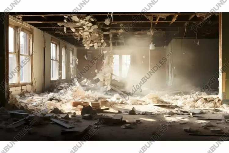 debris blurred demolition interior illustration scattered walls, torn down, chaos destruction debris blurred demolition interior