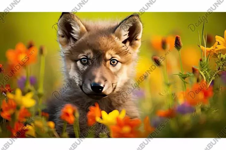 wildflowers gray wolf illustration innocence youth, vibrant colors, fur beauty wildflowers gray wolf