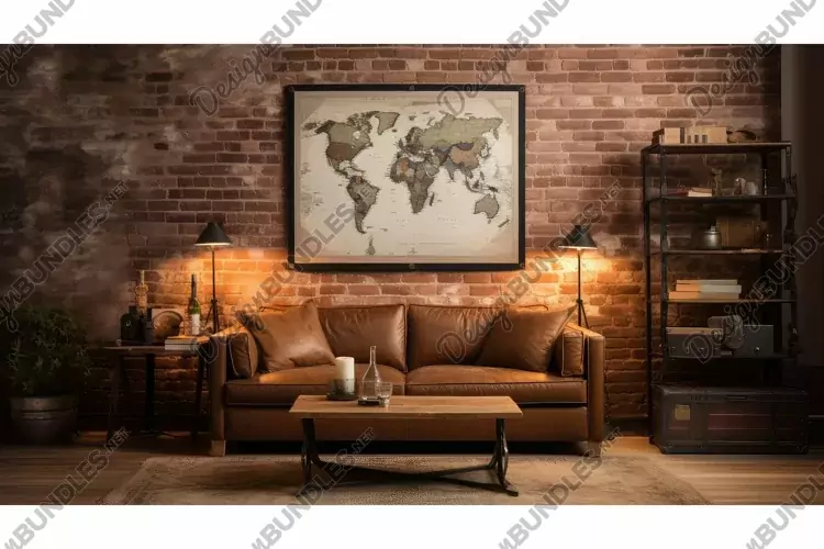 wooden rustic interior with poster illustration coffee map, brick wall, nostalgia space wooden rustic interior with poster