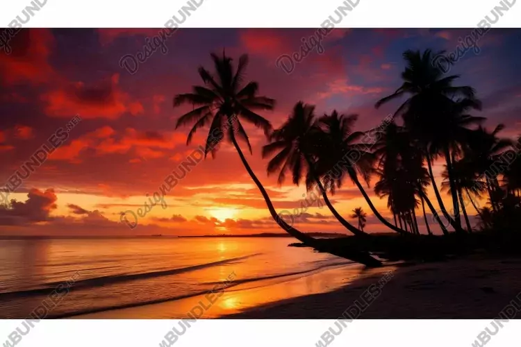orange blazing sun illustration pink breathtaking, palm trees, rays ocean orange blazing sun