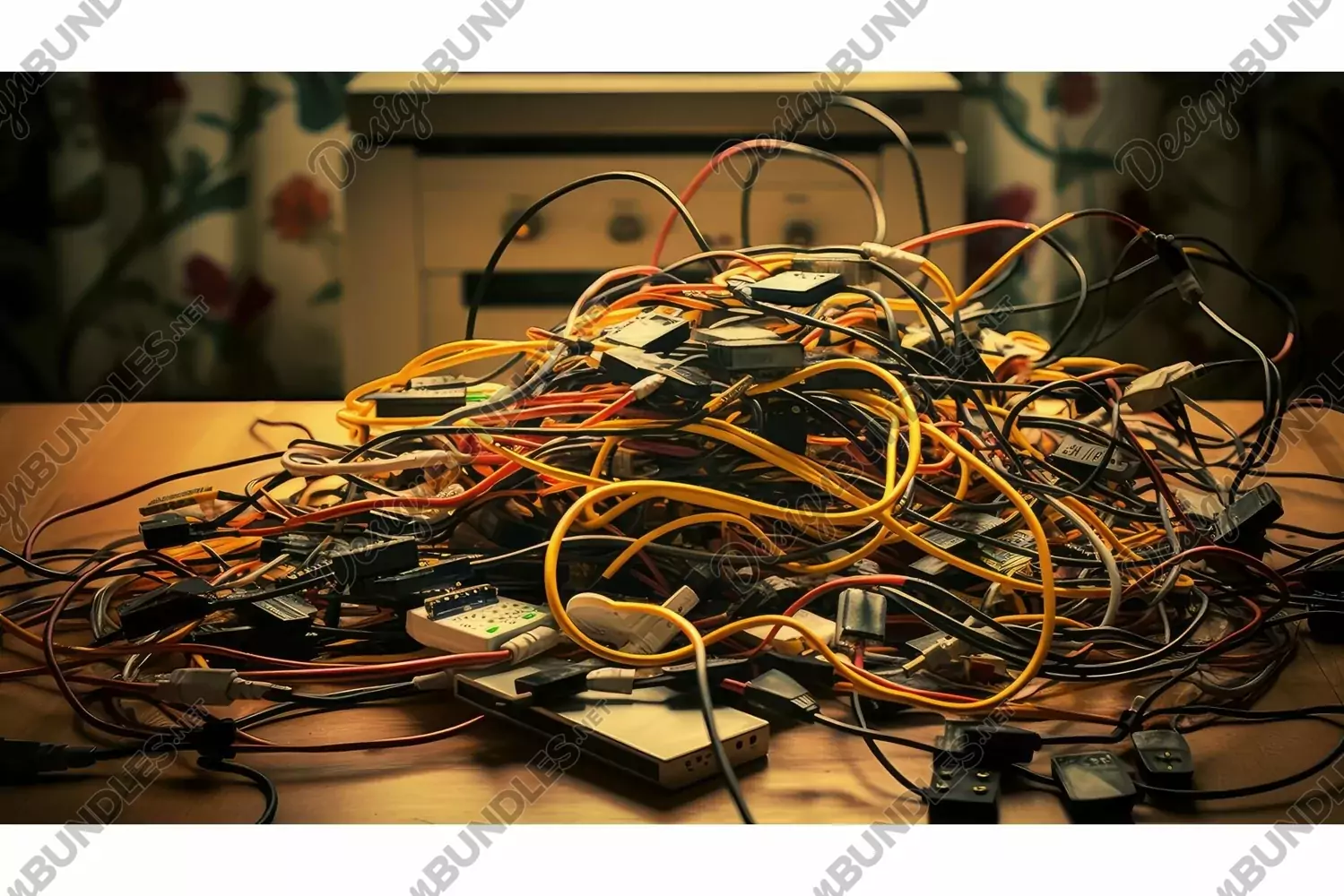desk charging cable illustration frustration chaos, arrangement digital, lives disorganized desk charging cable