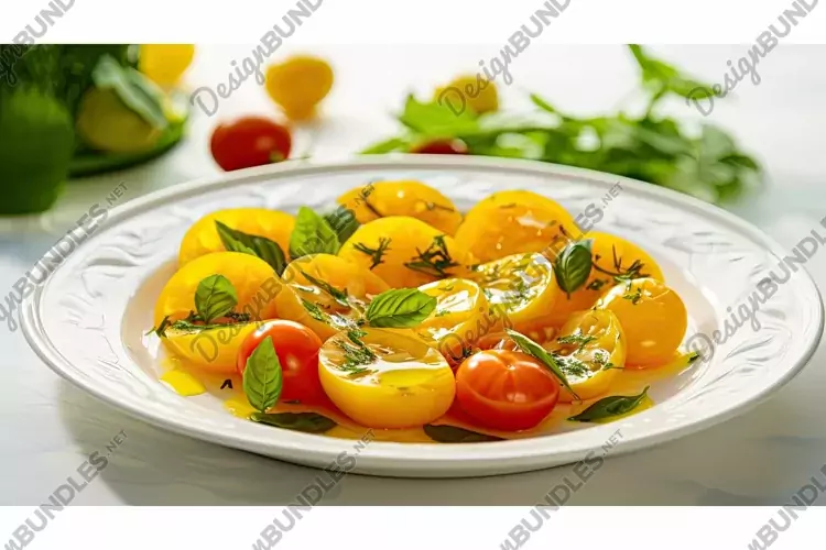 porcelain yellow tomatoes illustration plate colorful, sliced fresh, basil leaves porcelain yellow tomatoes