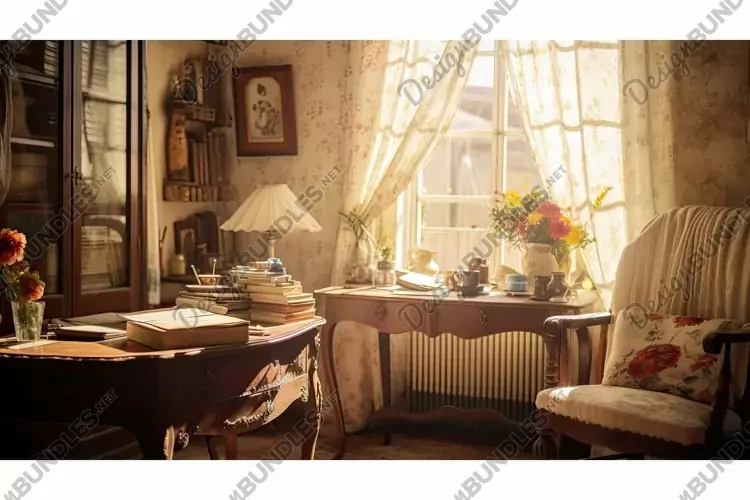 sunlight sunny room illustration antique wooden, desk armchair, curtains nostalgic sunlight sunny room