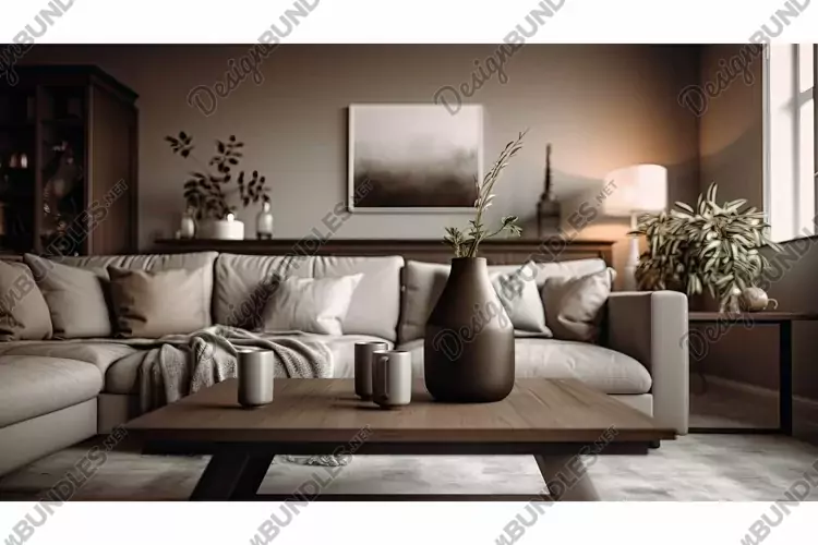 cozy blurred contemporary interior illustration living room, plush sofa, table depth cozy blurred contemporary interior