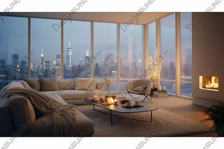 cozy blurred modern condo interior illustration living room, panoramic view, skyline soft cozy blurred modern condo interior