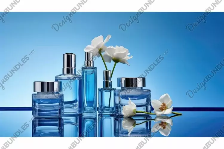 products blue background skincare illustration bottles jars, cleansers toners, essentials elegance products blue background skincare