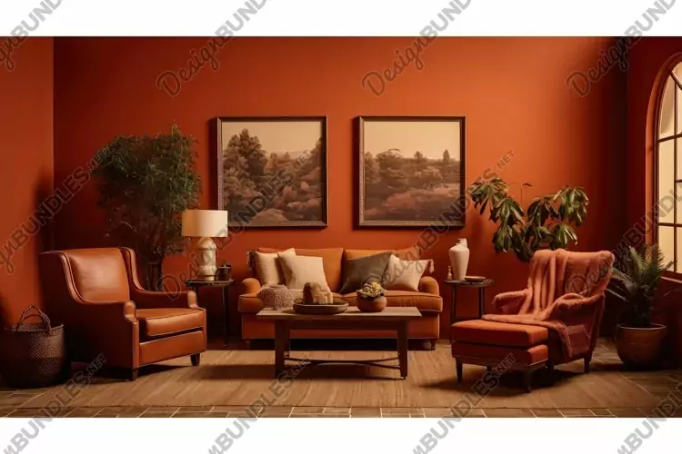 cozy paint interior illustration warm earthy, terracotta vintage, leather wooden cozy paint interior