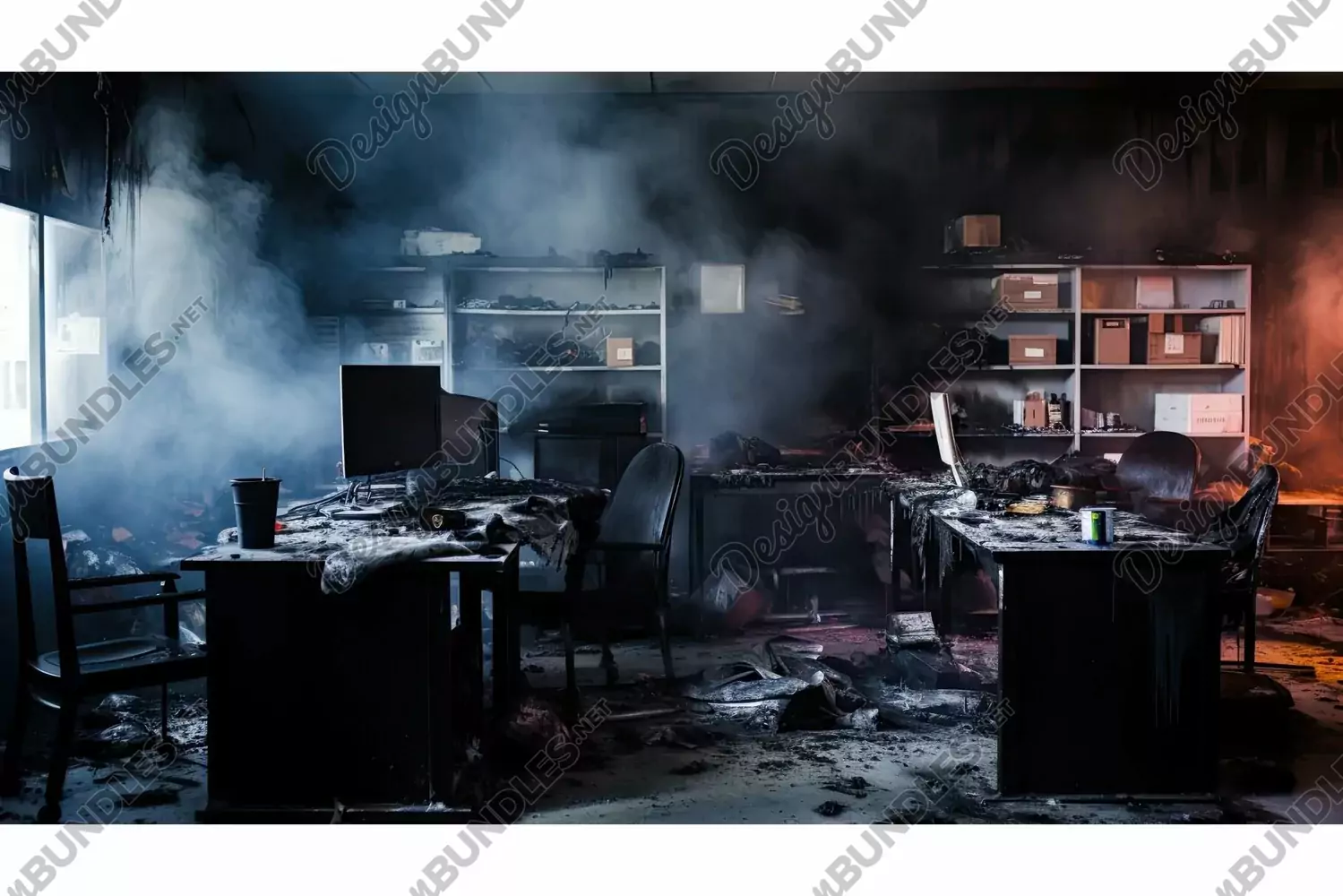 Illustration Interior Artwork Smoke Furniture Shelves Damage Soot Walls Desks
