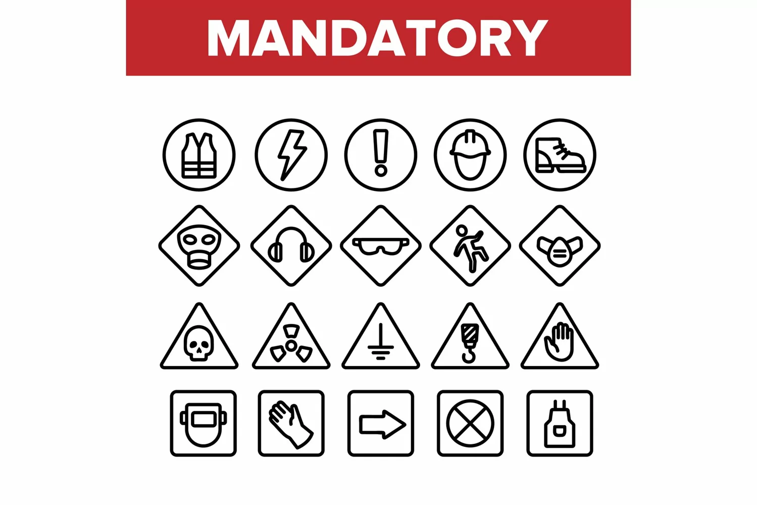 Collection Mandatory Signs Marks Vector Icons Set Thin Line. Safety And Health Protection Inform Mandatory Signs Linear Pictograms. Warning Alert Symbols Monochrome Contour Illustrations