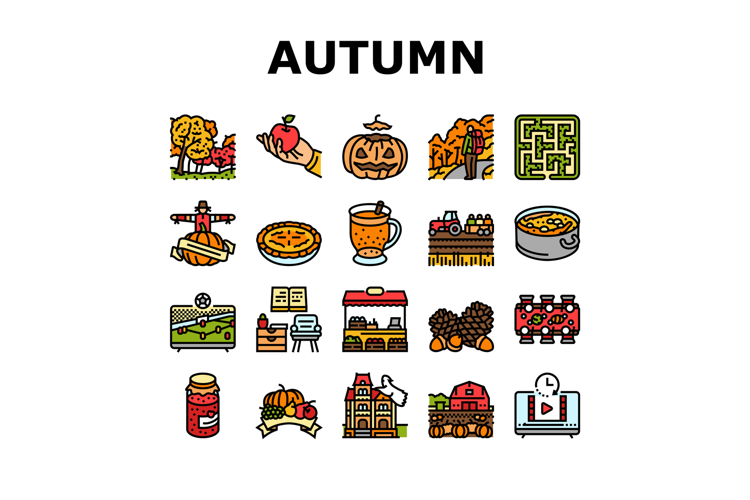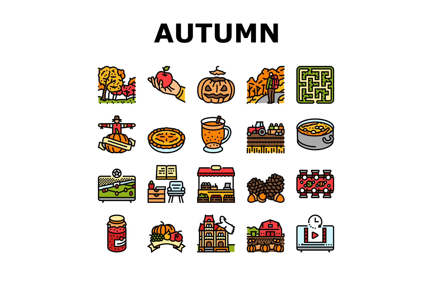 autumn spend time icons set vector. leaves harvest, pumpkin foliage, bonfires sweaters cider, hayrides cornmazes, acorns autumn spend time color line illustrations