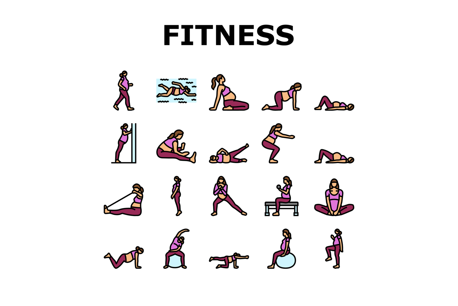 pregnant fitness icons set vector. exercise yoga, strength flexibility, wellness health, balance stamina, nutrition pregnant fitness color line illustrations