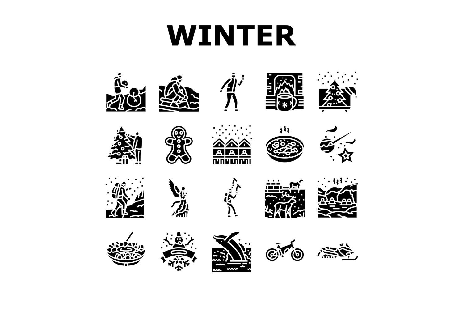 winter spend time icons set vector. snow skiing, snowboarding sledding, ice skating, fireplace cocoa, blankets winter spend time glyph pictogram Illustrations