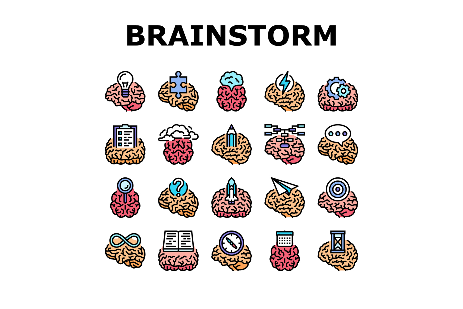 brainstorm business team think icons set vector. brain solution, strategy creative, teamwork people, work mind, human, bulb, target brainstorm business team think color line illustrations