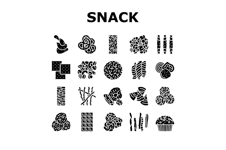 snack food drink sweet icons set vector. meal bread, lunch meat, chips, nut, cracker, rice cake, fruit slice, popcorn snack food drink sweet glyph pictogram Illustrations