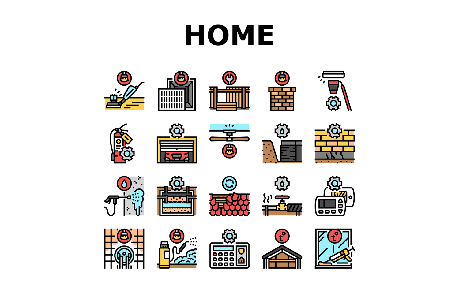 home maintenance cleaning icons set vector. plumbing roofing insulation, landscaping pest, hvac electrical, flooring siding home maintenance cleaning color line illustrations