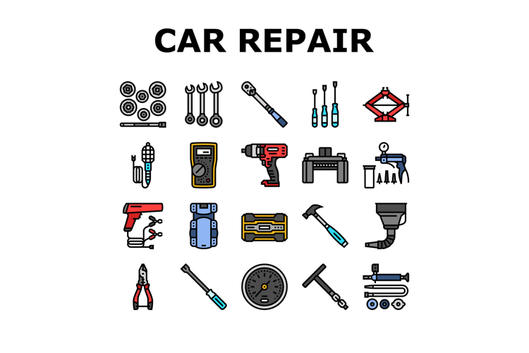 car repair tools wrench icons set vector. socket ratchet, pliers jack, lift screwdriver, multimeter, compressor, torque car repair tools wrench color line illustrations