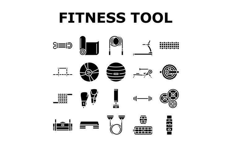 fitness tool dumbbell kettlebell icons set vector. treadmill barbell, resistance band jump rope, yoga mat, foam roller, medicine ball fitness tool dumbbell kettlebell glyph pictogram Illustrations