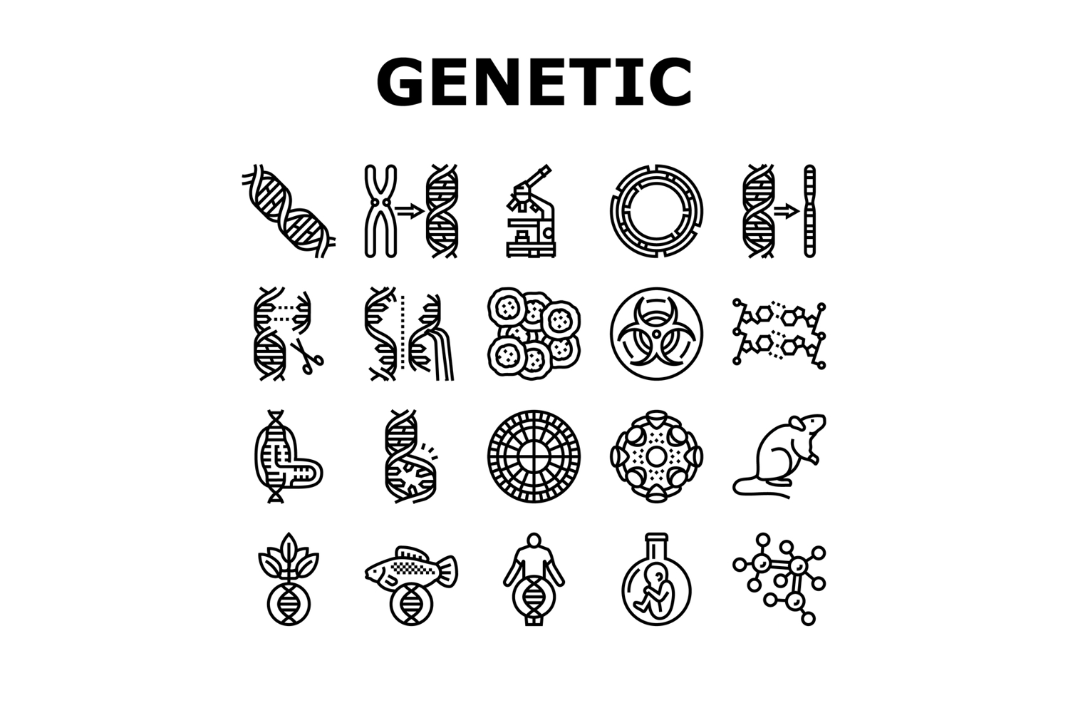 genetic engineering crispr genome icons set vector. dna editing, biotechnology genes, mutation cloning, transgenic bioinformatics genetic engineering crispr genome black contour illustrations