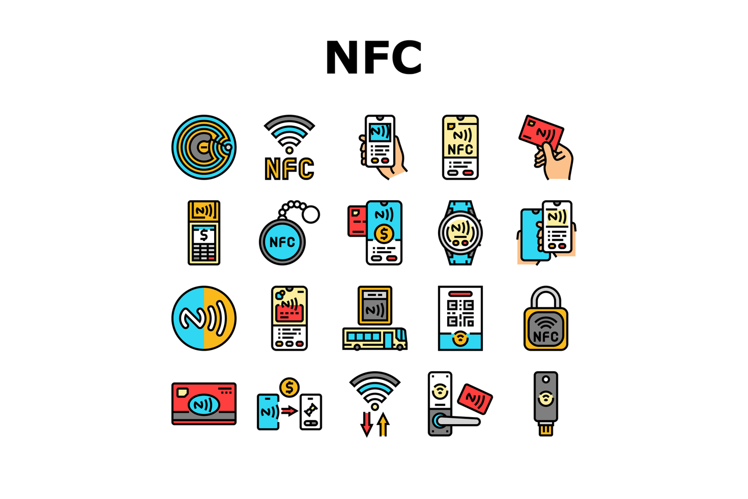 nfc technology contactless icons set vector. payment communication, proximity wireless, data transfer, chip tag, reader nfc technology contactless color line illustrations