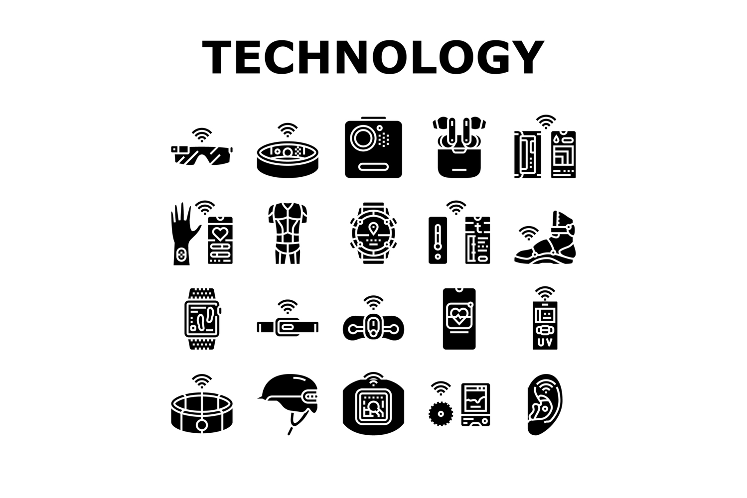 wearable technologies tracker icons set vector. wearables smartwatch, fitness tracker, health, monitor sensors, connectivity wearable technologies tracker glyph pictogram Illustrations